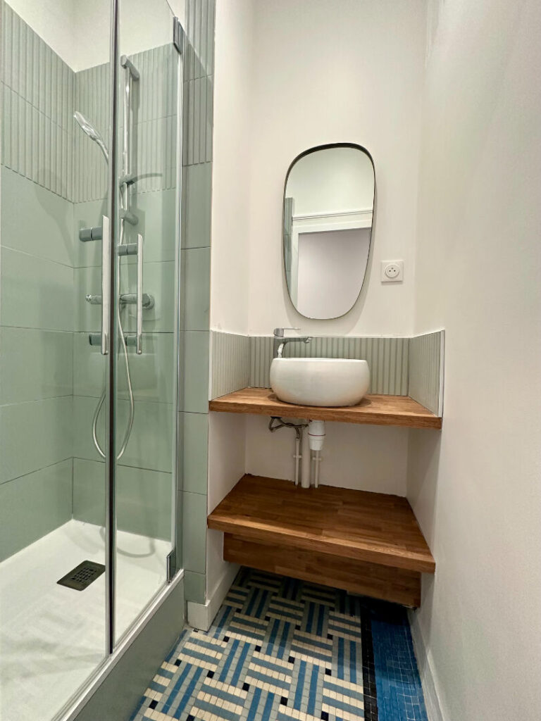 Travaux réalisés: Menuiseries dont celles côté rue à isolation renforcée, installation électricité – plomberie, volets roulants électriques, cuisine, salles d’eau, VMC, peinture murs – plafonds, isolation.